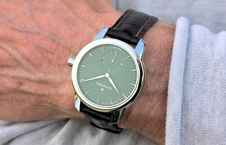Our Zeitwinkel model 188° features a decentral second and is available in a choice of dial colors. Some dials have an optional date window at the “3” position.